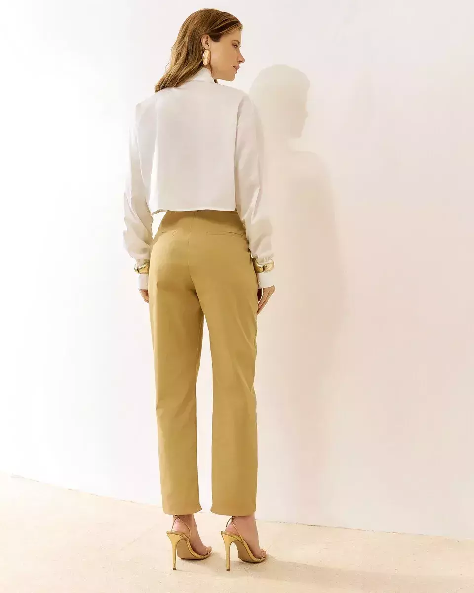 Calça Cáqui,Anne Fernandes. Calça modelo cenoura, possui detalhe de pasante no cós com botões em dourado, possui friso frontal e bolsos laterais.