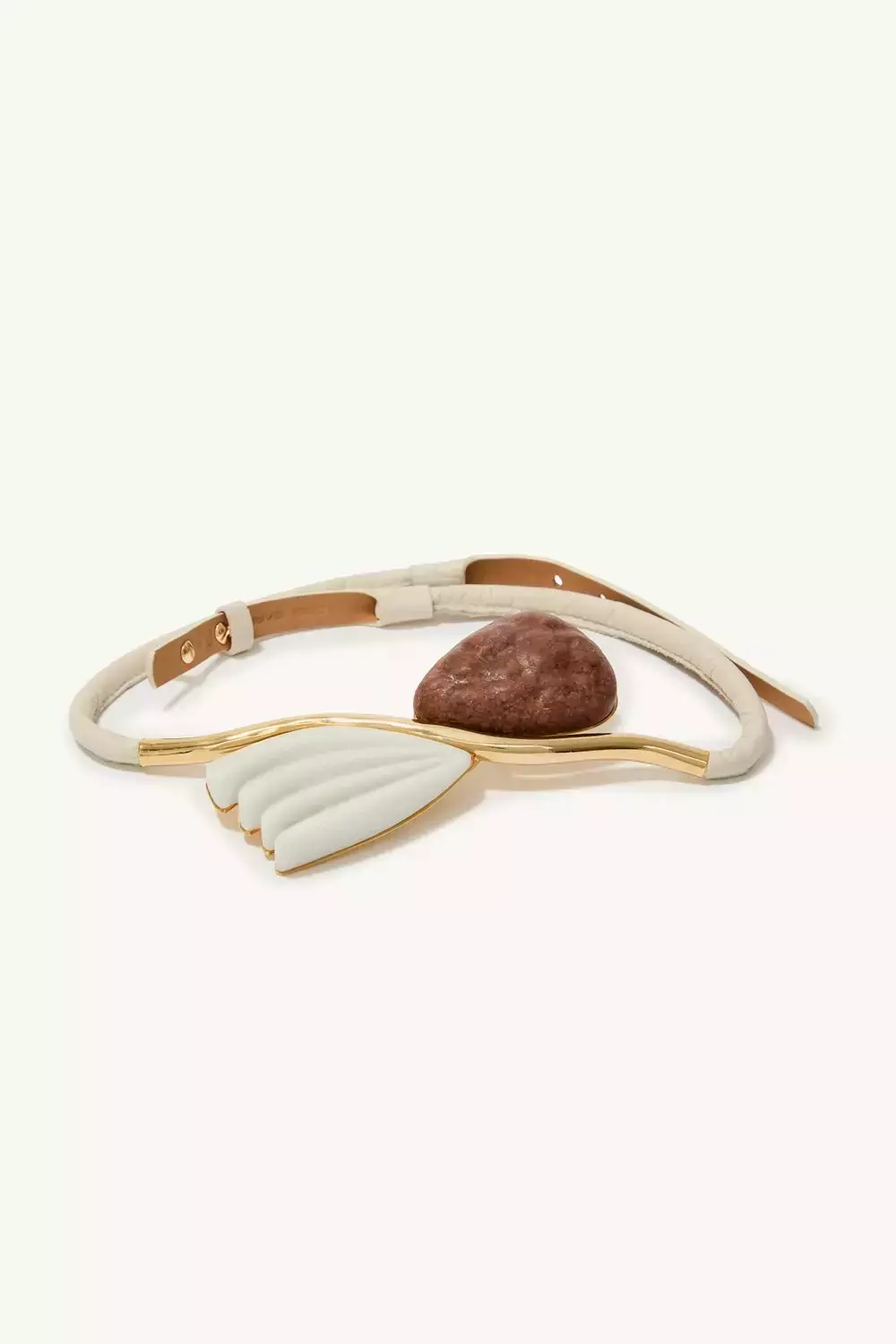 O cinto Lou CRIS BARROS é uma obra de arte. De rolote de couro, possui fivela jóia de metal, banhado à ouro, com design icônico e exclusivo, desenvolvido em nosso atelier, que mescla pedra e resina texturizada, fechamento por pino posterior.