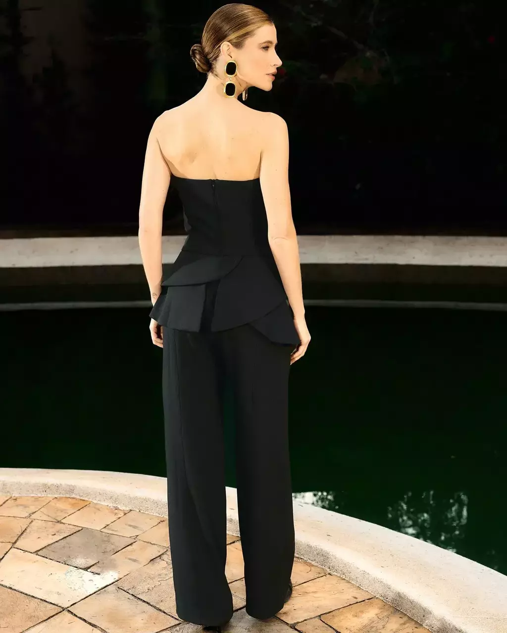 Macacão Peplum Preto,Anne Fernandes. Macacão sem alças, possui peplum em camadas e detalhe de botão frontal na cor dourada, modelo de calça reta, fechamento em zíper na parte das costas. Não acompanha outras peças.