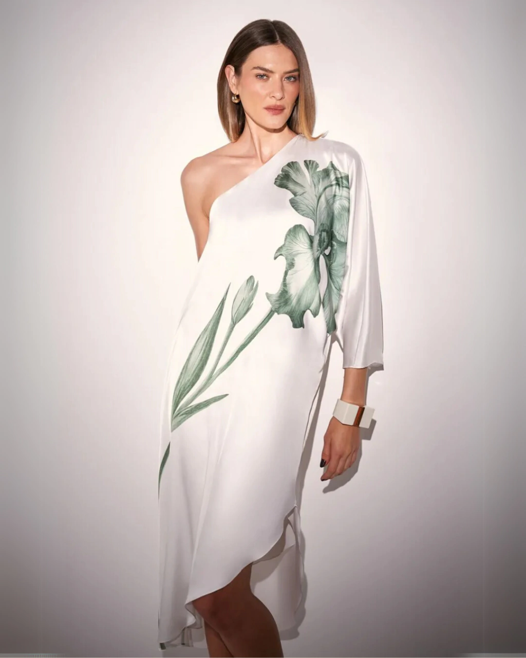 O Vestido Ana Paula é confeccionado em cetim, garantindo um caimento leve e delicado. A peça tem cor off-white e apresenta um design assimétrico de um ombro só, que agrega modernidade e sofisticação ao visual. A estampa em destaque é de uma flor verde, distribuída verticalmente, trazendo um toque de frescor e elegância. A modelagem solta proporciona conforto e fluidez, ideal para ocasiões elegantes e descontraídas.